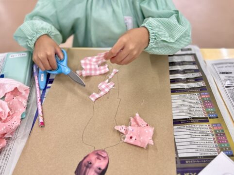ファッションデザインをしました! ちょっと、おとなになった、皆んなの身体に素敵な服を着せてもらいます 顔は写真を貼りつけました♡ 布やビーズを用意しましたよ 先ずは好きな布を選んで、服の形を考えます 切って、貼って、 布...