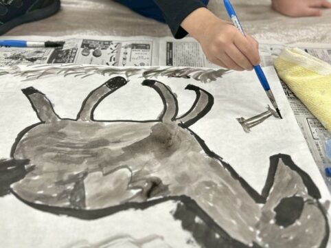 こちらのバイリンガル幼稚園では 墨を使って干支の馬を描きました 「今年はうま年だよ」 「うまを黒で描くの?」と今年初のお絵描きに皆んなもワクワクしている様子です 参考資料から好きな写真を選んで、写真の通りではなく自由に描...
