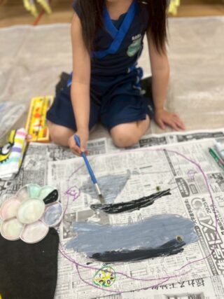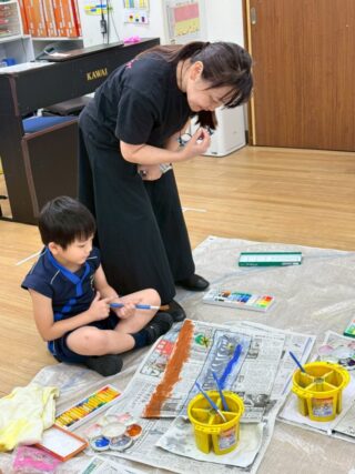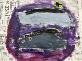 クレパスで大きく下絵を描いてから、絵の具を使って色をつけていきます