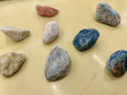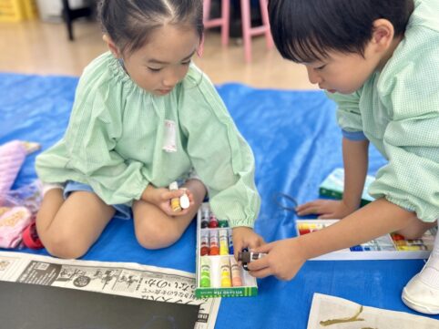 こちらの幼稚園クラスでは、石を使って模様を描いてみました ① 好きな色の絵の具を作ります ② 石を画用紙の上に置きます ③ 絵の具を付けた筆で、石を動かして模様を作ります 筆は『石』を連れて動きますので、自分の『意志』と...